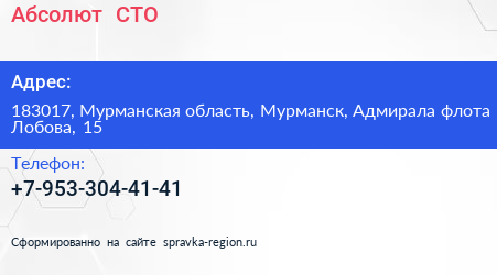 Абсолют+, СТО по адресу 183017, Мурманская область, Мурманск, Адмирала флота Лобова, 15 в дальнейшем Организация, размещена в следующих категориях: