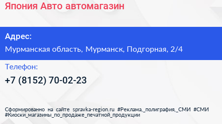 Япония Авто, автомагазин по адресу Мурманская область, Мурманск, Подгорная, 2/4 в дальнейшем Организация, размещена в следующих категориях: