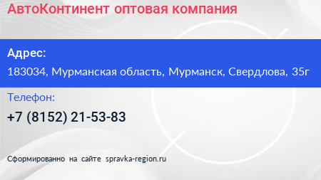 АвтоКонтинент, оптовая компания по адресу 183034, Мурманская область, Мурманск, Свердлова, 35г в дальнейшем Организация, размещена в следующих категориях:
