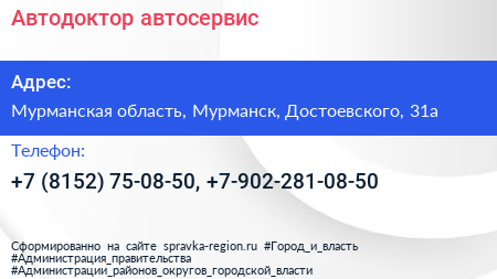 Автодоктор, автосервис по адресу Мурманская область, Мурманск, Достоевского, 31а в дальнейшем Организация, размещена в следующих категориях: