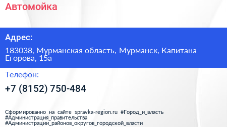 Автомойка по адресу 183038, Мурманская область, Мурманск, Капитана Егорова, 15а в дальнейшем Организация, размещена в следующих категориях: