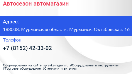 Автосезон, автомагазин по адресу 183038, Мурманская область, Мурманск, Октябрьская, 16 в дальнейшем Организация, размещена в следующих категориях:
