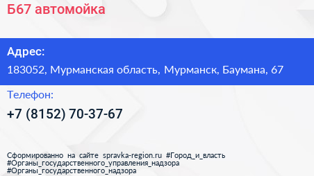 Б67, автомойка по адресу 183052, Мурманская область, Мурманск, Баумана, 67 в дальнейшем Организация, размещена в следующих категориях: