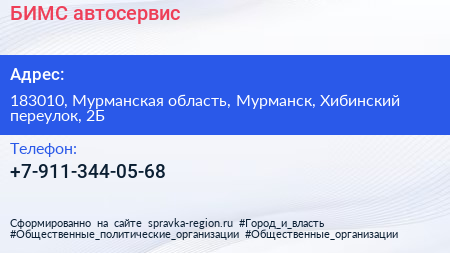 БИМС, автосервис по адресу 183010, Мурманская область, Мурманск, Хибинский переулок, 2Б в дальнейшем Организация, размещена в следующих категориях: