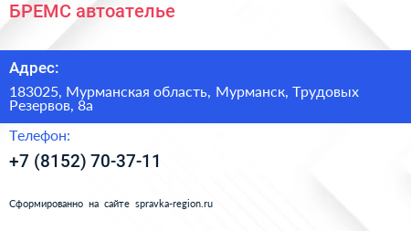 БРЕМС, автоателье по адресу 183025, Мурманская область, Мурманск, Трудовых Резервов, 8а в дальнейшем Организация, размещена в следующих категориях: