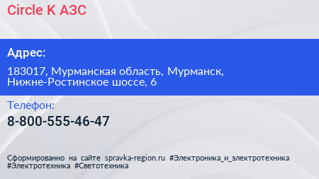 Circle K, АЗС по адресу 183017, Мурманская область, Мурманск, Нижне-Ростинское шоссе, 6 в дальнейшем Организация, размещена в следующих категориях: