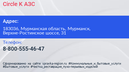 Circle K, АЗС по адресу 183036, Мурманская область, Мурманск, Верхне-Ростинское шоссе, 31 в дальнейшем Организация, размещена в следующих категориях: