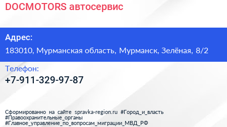 DOCMOTORS, автосервис по адресу 183010, Мурманская область, Мурманск, Зелёная, 8/2 в дальнейшем Организация, размещена в следующих категориях: