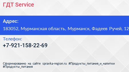 ГДТ-Service по адресу 183052, Мурманская область, Мурманск, Фадеев Ручей, 12 в дальнейшем Организация, размещена в следующих категориях: