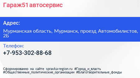 Гараж51, автосервис по адресу Мурманская область, Мурманск, проезд Автомобилистов, 2Б в дальнейшем Организация, размещена в следующих категориях:
