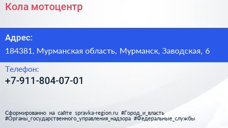 Кола, мотоцентр по адресу 184381, Мурманская область, Мурманск, Заводская, 6 в дальнейшем Организация, размещена в следующих категориях: