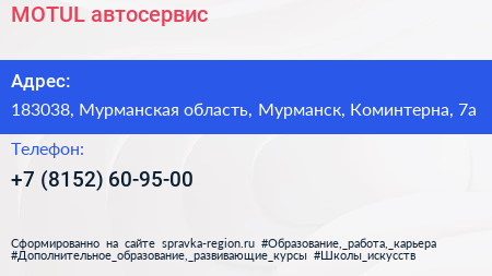 MOTUL, автосервис по адресу 183038, Мурманская область, Мурманск, Коминтерна, 7а в дальнейшем Организация, размещена в следующих категориях:
