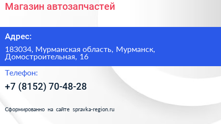 Магазин автозапчастей по адресу 183034, Мурманская область, Мурманск, Домостроительная, 16 в дальнейшем Организация, размещена в следующих категориях: