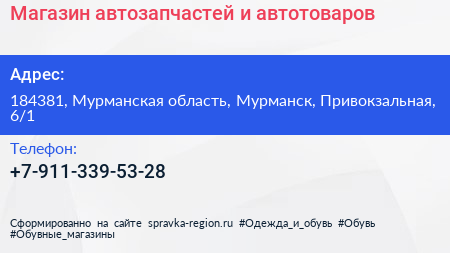Магазин автозапчастей и автотоваров по адресу 184381, Мурманская область, Мурманск, Привокзальная, 6/1 в дальнейшем Организация, размещена в следующих категориях: