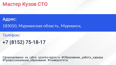 Мастер Кузов, СТО по адресу 183010, Мурманская область, Мурманск, в дальнейшем Организация, размещена в следующих категориях: