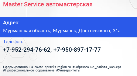 Master Service, автомастерская по адресу Мурманская область, Мурманск, Достоевского, 31а в дальнейшем Организация, размещена в следующих категориях: