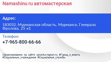 Namashinu.ru, автомастерская по адресу 183032, Мурманская область, Мурманск, Генерала Фролова, 25 к1 в дальнейшем Организация, размещена в следующих категориях: