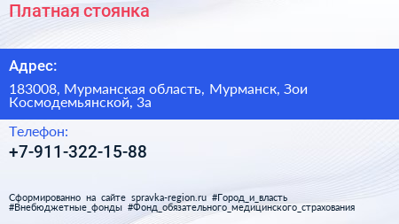 Платная стоянка по адресу 183008, Мурманская область, Мурманск, Зои Космодемьянской, 3а в дальнейшем Организация, размещена в следующих категориях: