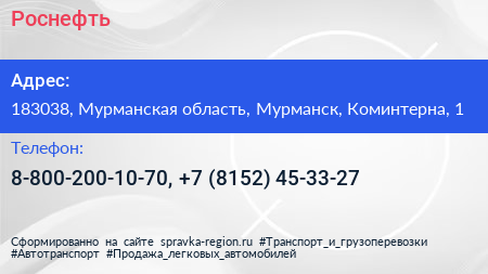 Роснефть по адресу 183038, Мурманская область, Мурманск, Коминтерна, 1 в дальнейшем Организация, размещена в следующих категориях: