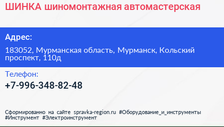 ШИНКА, шиномонтажная автомастерская по адресу 183052, Мурманская область, Мурманск, Кольский проспект, 110д в дальнейшем Организация, размещена в следующих категориях: