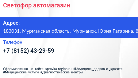 Светофор, автомагазин по адресу 183031, Мурманская область, Мурманск, Юрия Гагарина, 8 в дальнейшем Организация, размещена в следующих категориях: