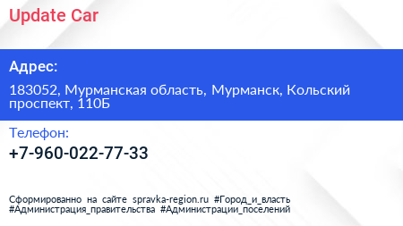 Update Car по адресу 183052, Мурманская область, Мурманск, Кольский проспект, 110Б в дальнейшем Организация, размещена в следующих категориях: