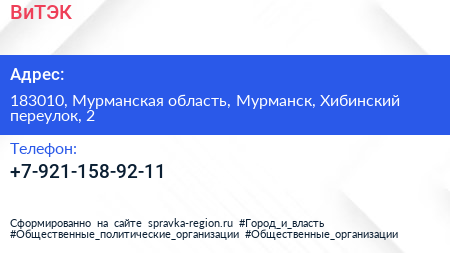 ВиТЭК по адресу 183010, Мурманская область, Мурманск, Хибинский переулок, 2 в дальнейшем Организация, размещена в следующих категориях: