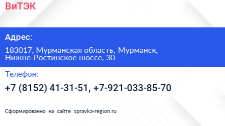 ВиТЭК по адресу 183017, Мурманская область, Мурманск, Нижне-Ростинское шоссе, 30 в дальнейшем Организация, размещена в следующих категориях: