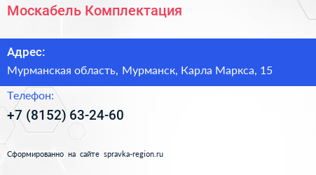 Москабель-Комплектация по адресу Мурманская область, Мурманск, Карла Маркса, 15 в дальнейшем Организация, размещена в следующих категориях: