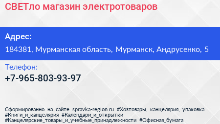СВЕТло, магазин электротоваров по адресу 184381, Мурманская область, Мурманск, Андрусенко, 5 в дальнейшем Организация, размещена в следующих категориях: