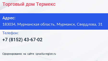 Торговый дом Термекс по адресу 183034, Мурманская область, Мурманск, Свердлова, 31 в дальнейшем Организация, размещена в следующих категориях: