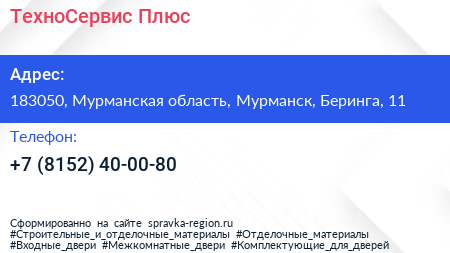 ТехноСервис Плюс по адресу 183050, Мурманская область, Мурманск, Беринга, 11 в дальнейшем Организация, размещена в следующих категориях: