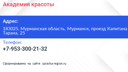 Академия красоты по адресу 183025, Мурманская область, Мурманск, проезд Капитана Тарана, 25 в дальнейшем Организация, размещена в следующих категориях: