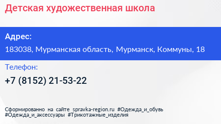 Детская художественная школа по адресу 183038, Мурманская область, Мурманск, Коммуны, 18 в дальнейшем Организация, размещена в следующих категориях: