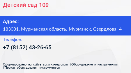 Детский сад №109 по адресу 183031, Мурманская область, Мурманск, Свердлова, 4 в дальнейшем Организация, размещена в следующих категориях:
