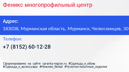Феникс, многопрофильный центр по адресу 183038, Мурманская область, Мурманск, Челюскинцев, 30 в дальнейшем Организация, размещена в следующих категориях: