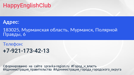 HappyEnglishClub по адресу 183025, Мурманская область, Мурманск, Полярной Правды, 6 в дальнейшем Организация, размещена в следующих категориях: