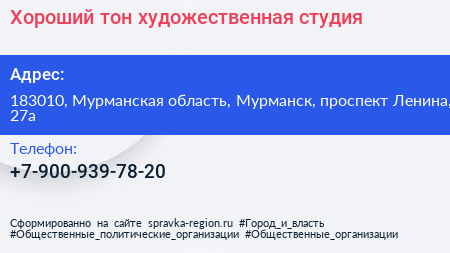 Хороший тон, художественная студия по адресу 183010, Мурманская область, Мурманск, проспект Ленина, 27а в дальнейшем Организация, размещена в следующих категориях: