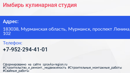 Имбирь, кулинарная студия по адресу 183038, Мурманская область, Мурманск, проспект Ленина, 102 в дальнейшем Организация, размещена в следующих категориях: