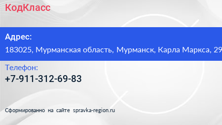 КодКласс по адресу 183025, Мурманская область, Мурманск, Карла Маркса, 29 в дальнейшем Организация, размещена в следующих категориях: