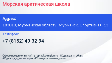 Морская арктическая школа по адресу 183010, Мурманская область, Мурманск, Спортивная, 13 в дальнейшем Организация, размещена в следующих категориях: