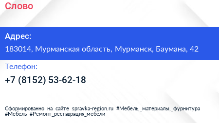Слово по адресу 183014, Мурманская область, Мурманск, Баумана, 42 в дальнейшем Организация, размещена в следующих категориях: