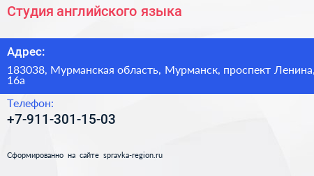 Студия английского языка по адресу 183038, Мурманская область, Мурманск, проспект Ленина, 16а в дальнейшем Организация, размещена в следующих категориях: