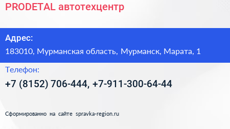 PRODETAL, автотехцентр по адресу 183010, Мурманская область, Мурманск, Марата, 1 в дальнейшем Организация, размещена в следующих категориях: