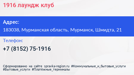 #1916, лаундж-клуб по адресу 183038, Мурманская область, Мурманск, Шмидта, 21 в дальнейшем Организация, размещена в следующих категориях: