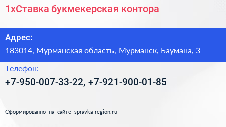 1xСтавка, букмекерская контора по адресу 183014, Мурманская область, Мурманск, Баумана, 3 в дальнейшем Организация, размещена в следующих категориях: