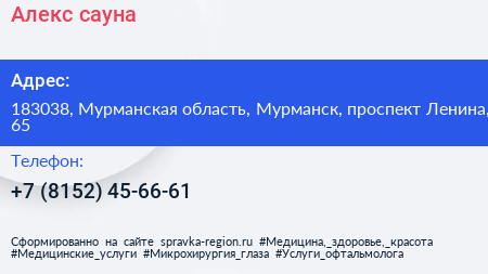Алекс, сауна по адресу 183038, Мурманская область, Мурманск, проспект Ленина, 65 в дальнейшем Организация, размещена в следующих категориях: