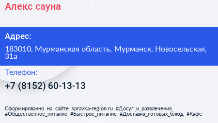 Алекс, сауна по адресу 183010, Мурманская область, Мурманск, Новосельская, 31а в дальнейшем Организация, размещена в следующих категориях: