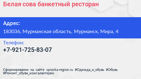 Белая сова, банкетный ресторан по адресу 183036, Мурманская область, Мурманск, Мира, 4 в дальнейшем Организация, размещена в следующих категориях:
