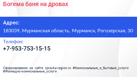 Богема, баня на дровах по адресу 183039, Мурманская область, Мурманск, Рогозерская, 30 в дальнейшем Организация, размещена в следующих категориях: